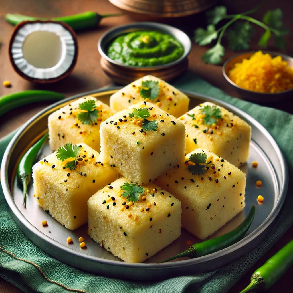 Khaman Dhokla is a delightful steamed snack from Gujarat, made from fermented gram flour batter. The batter is mixed with spices, ginger, and green chilies, then poured into a steaming tray. Once cooked, it’s tempered with mustard seeds and garnished with fresh coriander and grated coconut. Light, fluffy, and mildly spiced, Khaman Dhokla is perfect for breakfast or as a savory treat during tea time.